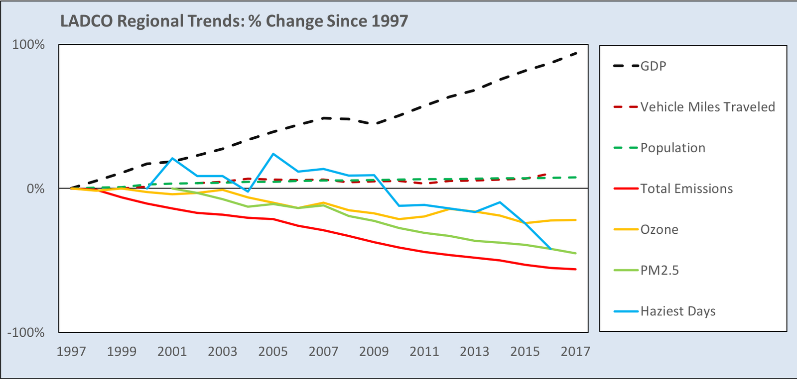 The first thing to point out about the air quality across the LADCO region is that it is better than it has ever been. Over the past 20 years the total emissions of several major air pollutants have dropped 50%. Ozone and fine particulate matter (PM2.5) concentrations have decreased 22% and 45%, respectively. The number of haziest days in our scenic areas have decreased by over 40%. All of these improvements have occurred while the regional annual Gross Domestic Product (GDP) has doubled over the same period. Both population and vehicle miles traveled have also increased (~10%) over the past 20 years.