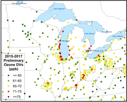 Despite the progress in reducing air pollution over the last three decades, there are persistent problems in the region. Ground-level ozone concentrations continue to exceed the National Ambient Air Quality Standards (NAAQS) along the shores of Lake Michigan and in many of our larger urban areas. The map at the left shows recent policy-relevant ozone concentrations (i.e., design values) at measurement sites in our region. The locations that are exceeding the NAAQS are shown as red and purple.