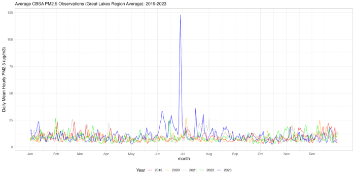 The figure below shows the daily fine particle pollution (PM2.5) concentrations average across all monitors in the Great Lakes region for the year 2019-2023. Each colored line represents the daily average for each year. The particle concentrations in 2023 are shown by the blue line, with several high pollution events between June and September. The late June 2023 event was historic and led some media outlets to declare that cities in the region had the “worst air pollution in the world” during that period.